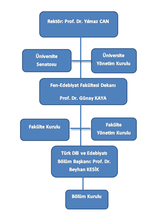 Türk Dili ve Edebiyatı Bölümü, Bölüm Başkanı başkanlığında; başkan yardımcıları ile ana bilim dalı başkanlarının yer aldığı Bölüm Kurulu tarafından yönetilir. Bölüm, idari açıdan Fen-Edebiyat Fakültesi Dekanı ve fakülte kurullarına; fakülte ise Üniversite Rektörlüğü ve üniversite kurullarına bağlıdır.